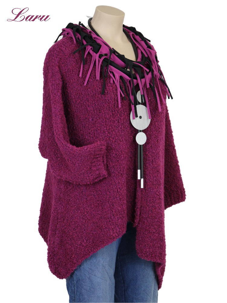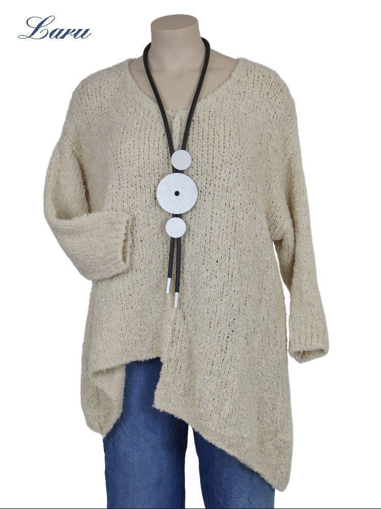 Der Pullover ist asymetrisch mit Versatz gestrickt.