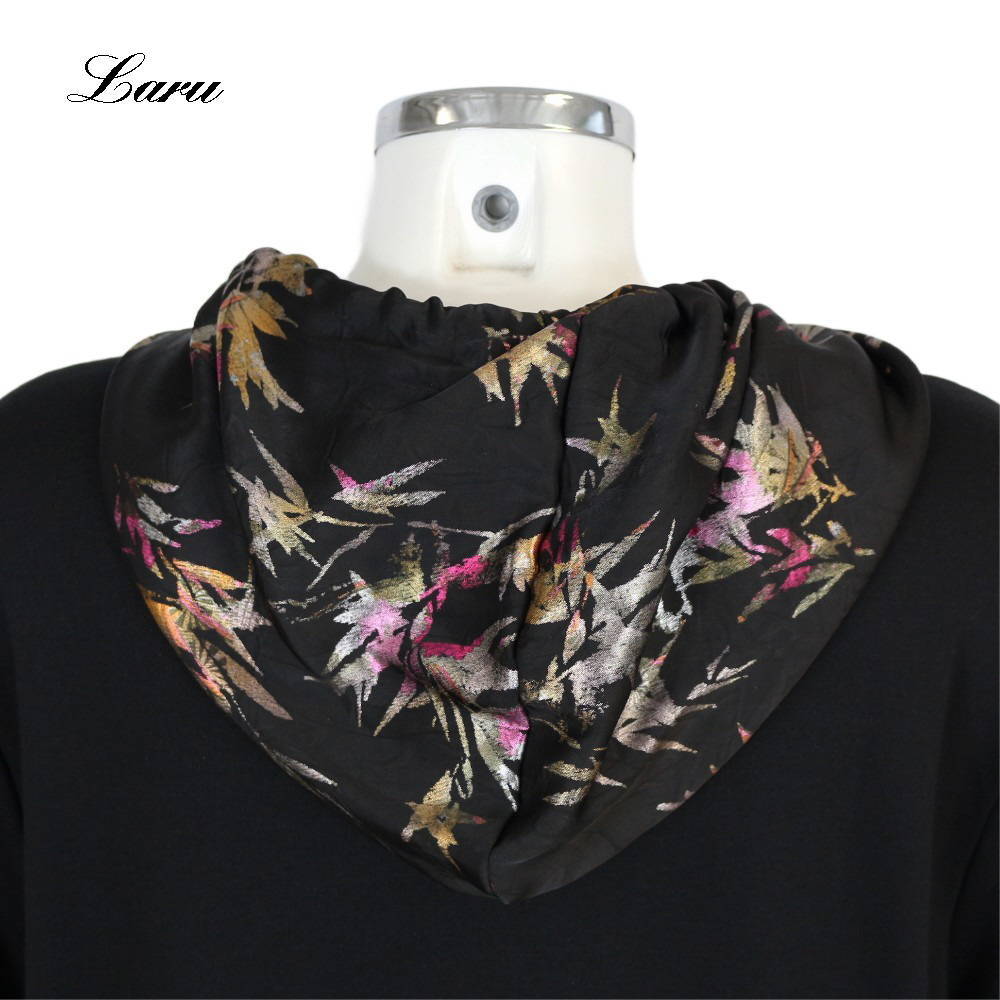 In schwarz mit schwarz/bunter Aplikation bzw. Kapuze.